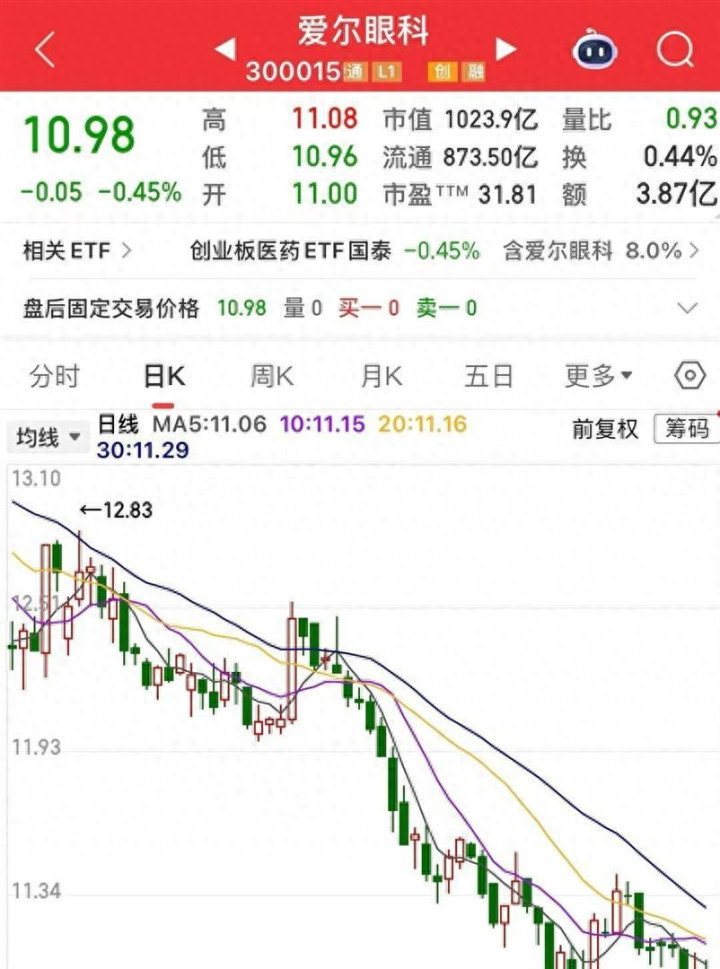 医药白马股爱尔眼科的遭遇同样惨淡。 2020年,它还是众多机构和散户的重仓股,股价一度超过42元。 随后四年多,它一路下跌寻底。 2025年,爱尔眼科股价继续下跌42%,年底报收在10.98元左右。 从高点算起,它的跌幅达到了75%。 它的走势图呈现出一种让人绝望的规律:每次弱势反弹一两天后,就会迎来加速下跌。 公司2025年前三季度的净利润还有31.15亿元,基本面看似不差,但超过34万股东面对不断缩水的市值,许多人的选择是“锁仓”,不再看账户。