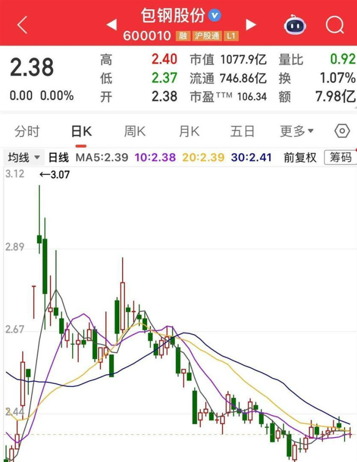 包钢股份在2025年8月曾有一波短暂的行情,股价从长期徘徊的2元以下,最高冲到了3.07元。 这让许多在前期4.12元高位被套的投资者燃起了希望。 然而,行情很快结束,股价调头向下,到年底跌至2.38元,仅仅几个月时间,从高点算起短期跌幅就达到22.5%。 这家拥有近90万股东的公司,股价再次回到了2元区间,套牢盘依旧沉重。