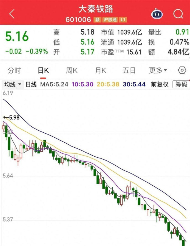 大秦铁路,这家以稳定分红著称的公路铁路运输巨头,在2025年下跌了28.5%。 它的K线图让很多老股民直摇头,日线图上几乎全是下跌的阴线,偶尔出现一根阳线,紧跟着的就是更深的跌幅。 它的股价从2024年6月至10月在6.2元到7元之间横盘了四个月后,就开启了一场长达一年多的漫长下跌,期间几乎没有任何像样的反弹。 到2025年底,它的股价停留在5.16元。 尽管公司2025年前三季度还有62.24亿元的净利润,尽管有超过21万股东在持续关注甚至抄底,但股价“跌跌不休”的趋势硬是没能扭转。