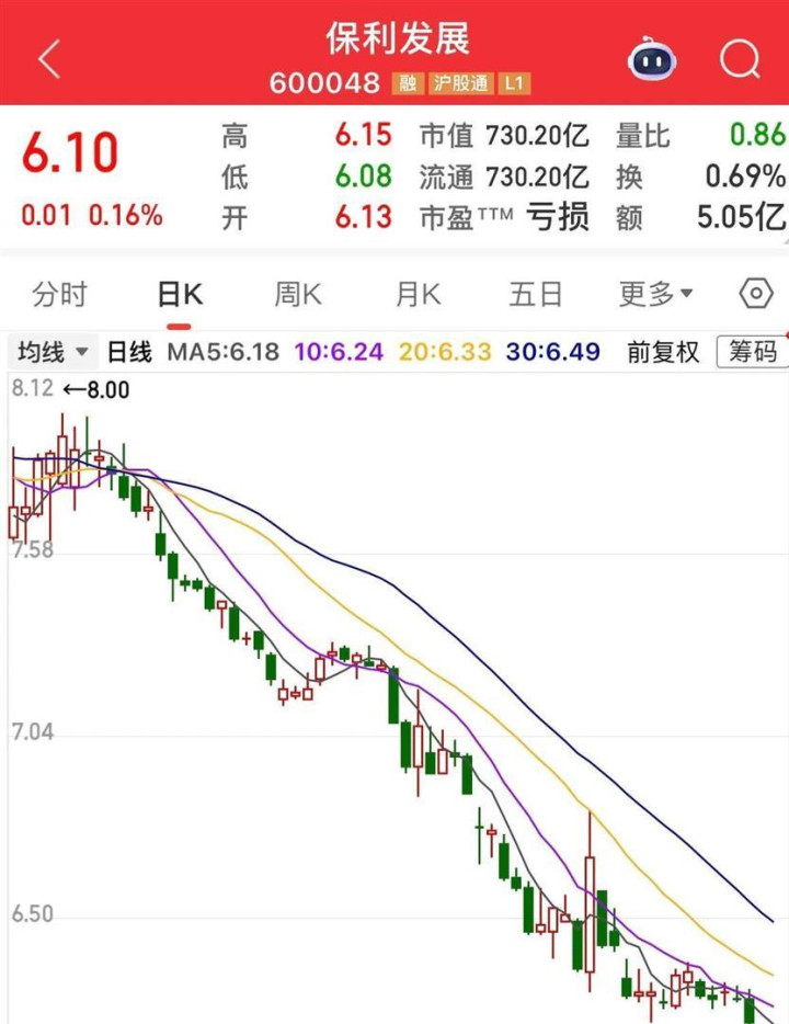 还有保利发展,这家头部房企的股价从年初的11.96元一路下跌至6.10元,全年跌幅为49%。 股价创下了近8年新低。 尽管公司2025年前三季度仍有19.29亿元的净利润,但丝毫不能阻挡下跌的趋势。 从更高点计算,其跌幅也达到了67%。 期间,有超过24万股东,其中一部分是在下跌途中试图抄底,结果悉数被套。