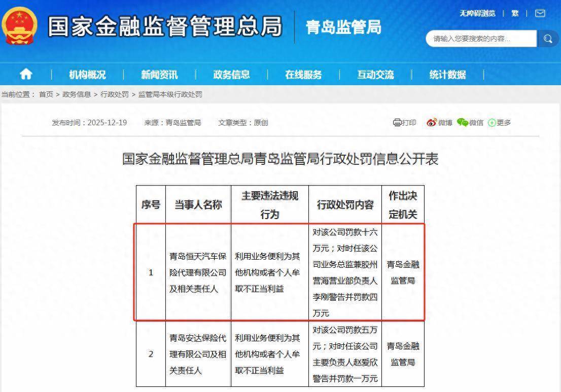 12月19日,青岛金融监管局公布,青岛恒天汽车保险代理有限公司因利用业务便利为其他机构或者个人牟取不正当利益明福今投,对该公司罚款十六万元。